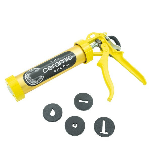 The Ceramic Shop's hand extruder will hold up to 3.5 pounds of clay and various other extrudable materials. The 9" barrel is easy to load and easy to use. The heavy duty plastic plunger tip helps direct the clay to the die plate evenly.